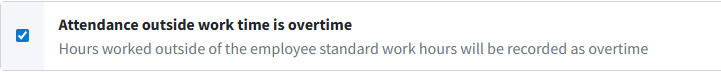 Example: If an employee is assigned to a work time 8:00 AM - 4:00 PM, and the allowed check-in/out window is 30 minutes. If the option Attendance outside worktime is overtime is enabled in the employee’s attendance settings, then if the employee checks in outside the worktime (for example, at 7:00 AM), the attendance settings will apply and any recorded working duration will be considered as overtime.